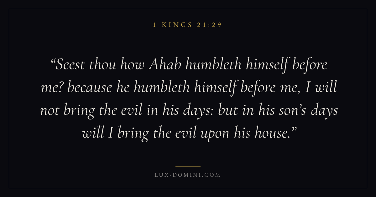 Seest thou how Ahab humbleth himself before me? because he humbleth himself before me, I will not bring the evil in his days: but in his son’s days will I bring the evil upon his house.