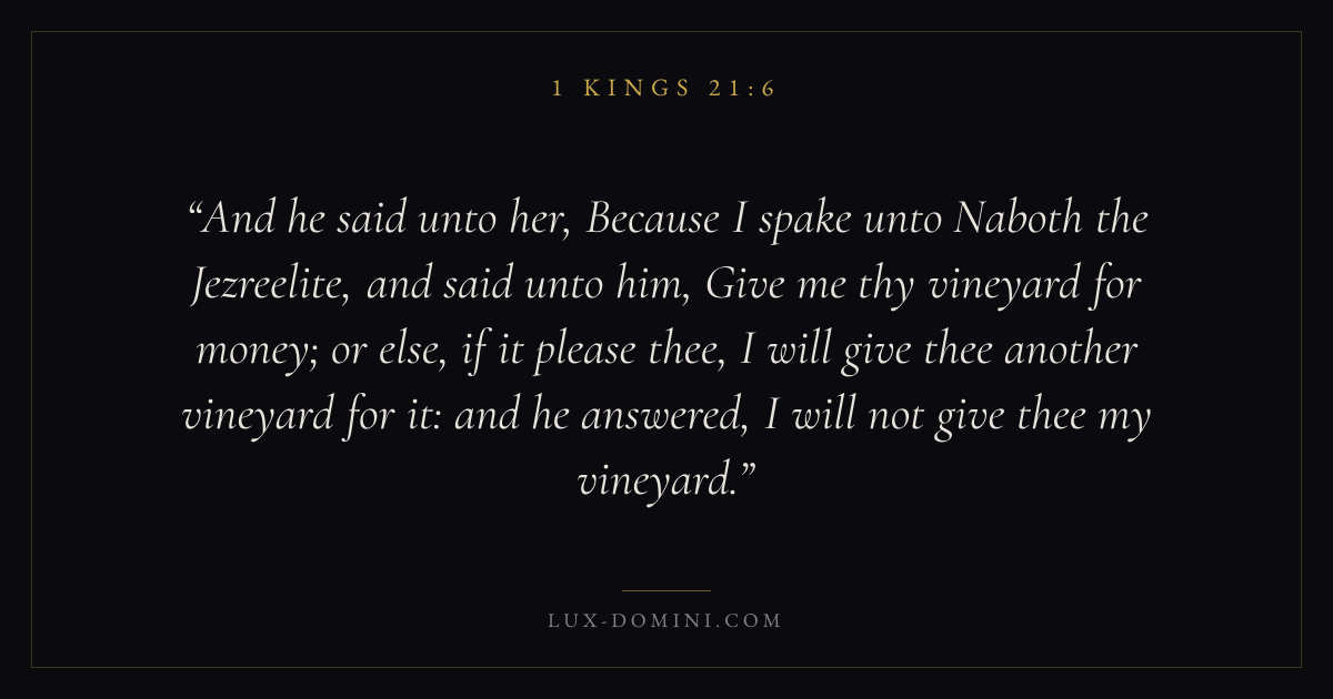 And he said unto her, Because I spake unto Naboth the Jezreelite, and said unto him, Give me thy vineyard for money; or else, if it please thee, I will give thee another vineyard for it: and he answered, I will not give thee my vineyard.