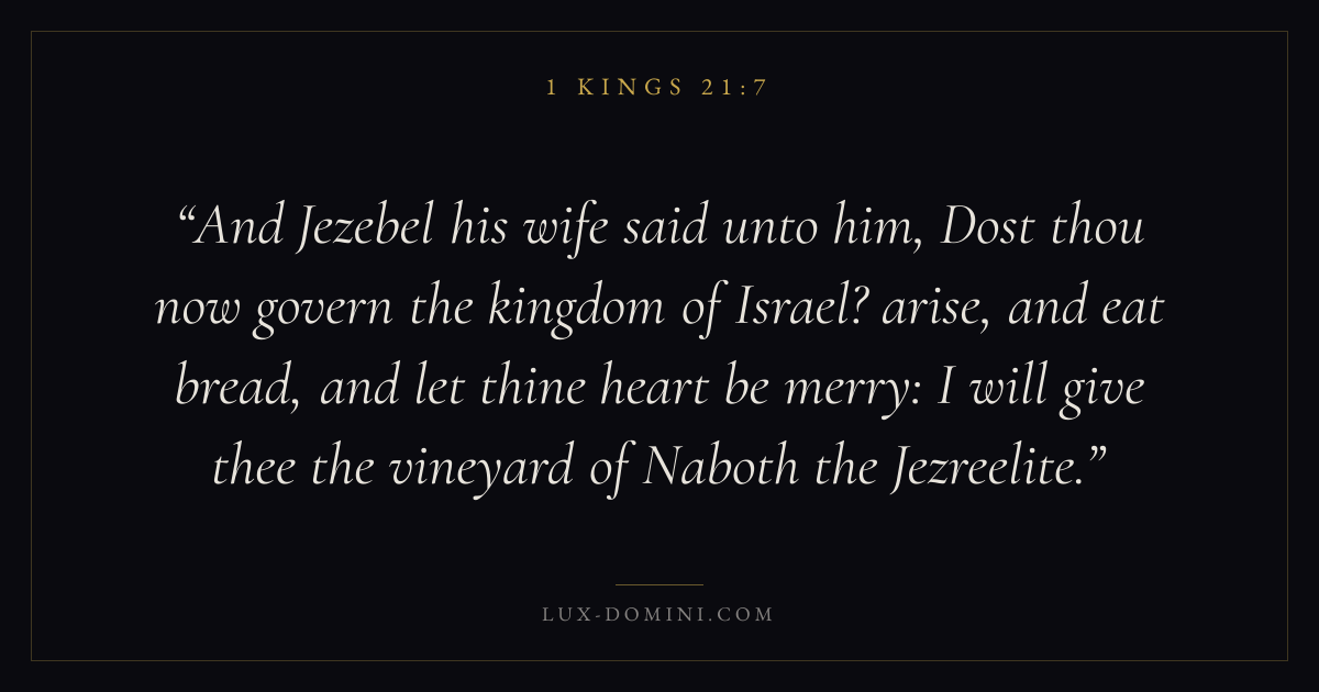 And Jezebel his wife said unto him, Dost thou now govern the kingdom of Israel? arise, and eat bread, and let thine heart be merry: I will give thee the vineyard of Naboth the Jezreelite.