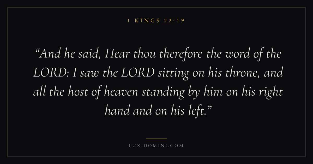 And he said, Hear thou therefore the word of the LORD: I saw the LORD sitting on his throne, and all the host of heaven standing by him on his right hand and on his left.