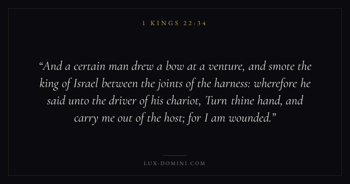 And a certain man drew a bow at a venture, and smote the king of Israel between the joints of the harness: wherefore he said unto the driver of his chariot, Turn thine hand, and carry me out of the host; for I am wounded.