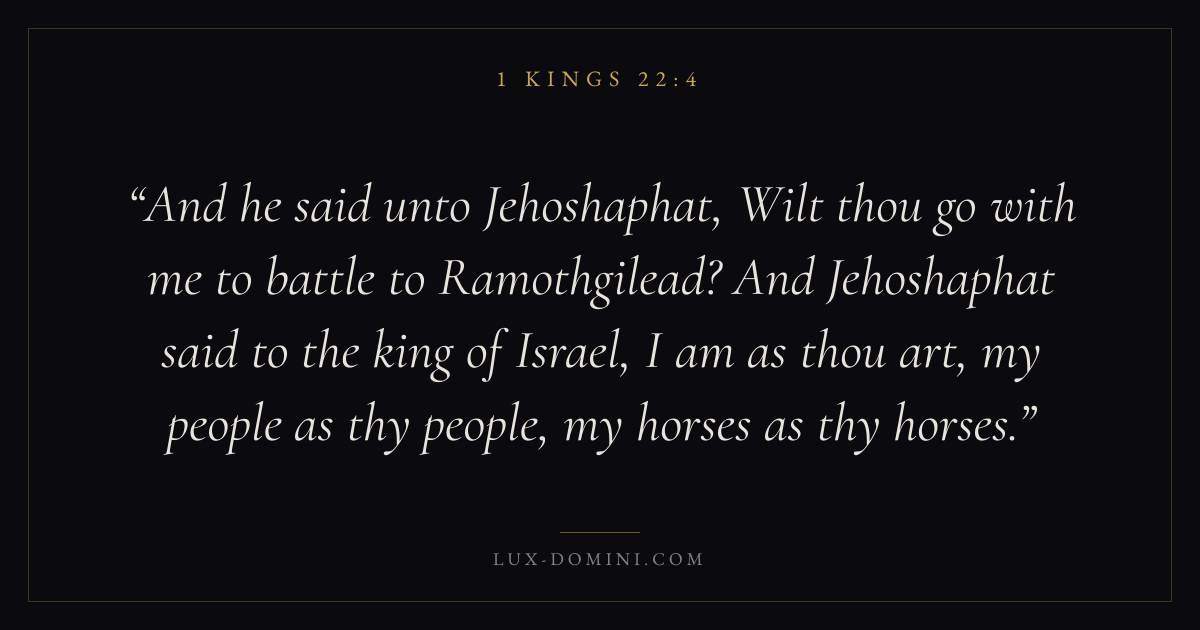 And he said unto Jehoshaphat, Wilt thou go with me to battle to Ramothgilead? And Jehoshaphat said to the king of Israel, I am as thou art, my people as thy people, my horses as thy horses.