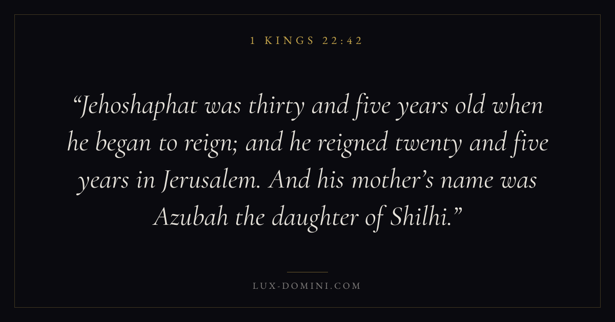 Jehoshaphat was thirty and five years old when he began to reign; and he reigned twenty and five years in Jerusalem. And his mother’s name was Azubah the daughter of Shilhi.