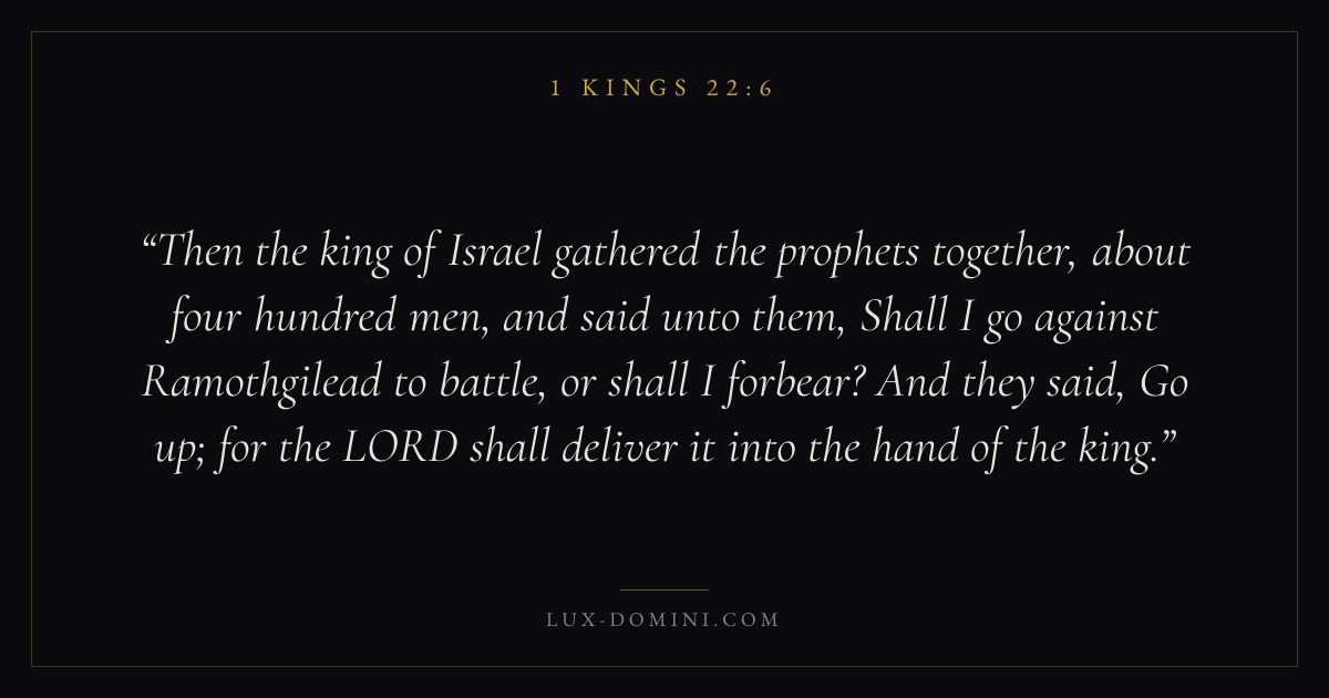 Then the king of Israel gathered the prophets together, about four hundred men, and said unto them, Shall I go against Ramothgilead to battle, or shall I forbear? And they said, Go up; for the LORD shall deliver it into the hand of the king.