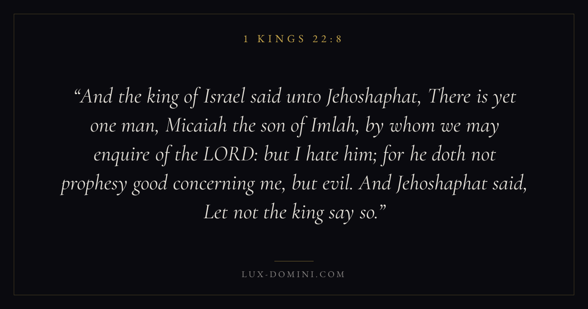 And the king of Israel said unto Jehoshaphat, There is yet one man, Micaiah the son of Imlah, by whom we may enquire of the LORD: but I hate him; for he doth not prophesy good concerning me, but evil. And Jehoshaphat said, Let not the king say so.