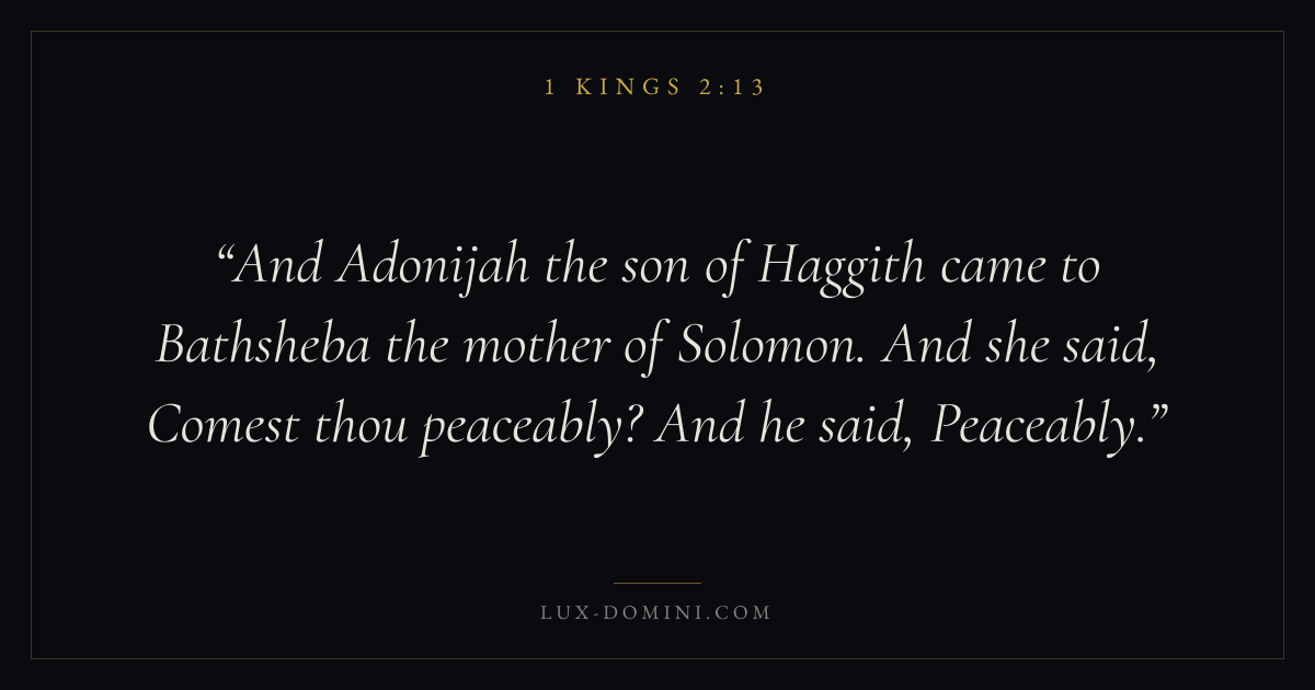 And Adonijah the son of Haggith came to Bathsheba the mother of Solomon. And she said, Comest thou peaceably? And he said, Peaceably.