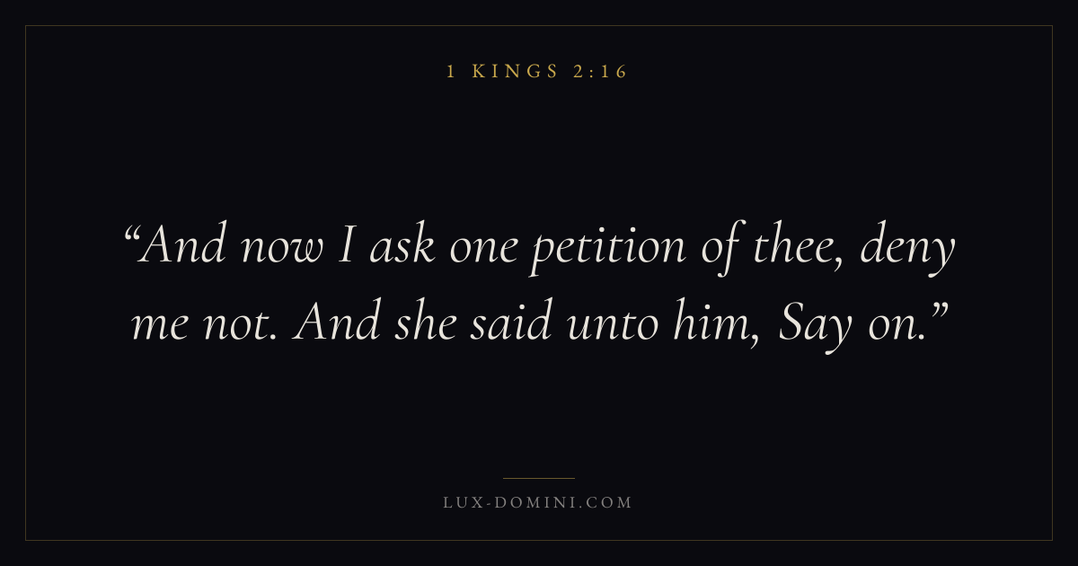 Books / 1 Kings / Chapter 2 / Verse 16 ← 1 Kings 2:15 1 Kings 2:16 1 Kings 2:17 → And now I ask one petition of thee, deny me not. And she said unto him, Say on. Download verse card Share on Twitter Share on Facebook Pin it ✦ Key themes PrayerWisdomJustice and mercyTemple Read with 1 Kings 2:141 Kings 2:15Matthew 6:9Luke 18:1 Related topics Bible verses about prayerBible verses about wisdomBible verses about justice and mercy ✦ 1 Kings Chapter 2 verses V. 1 V. 2 V. 3 V. 4 V. 5 V. 6 V. 7 V. 8 V. 9 V. 10 V. 11 V. 12 V. 13 V. 14 V. 15 V. 16 V. 17 V. 18 V. 19 V. 20 V. 21 V. 22 V. 23 V. 24 V. 25 V. 26 V. 27 V. 28 V. 29 V. 30 V. 31 V. 32 V. 33 V. 34 V. 35 V. 36 V. 37 V. 38 V. 39 V. 40 V. 41 V. 42 V. 43 V. 44 V. 45 V. 46