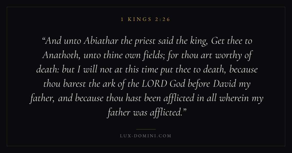 And unto Abiathar the priest said the king, Get thee to Anathoth, unto thine own fields; for thou art worthy of death: but I will not at this time put thee to death, because thou barest the ark of the LORD God before David my father, and because thou hast been afflicted in all wherein my father was afflicted.