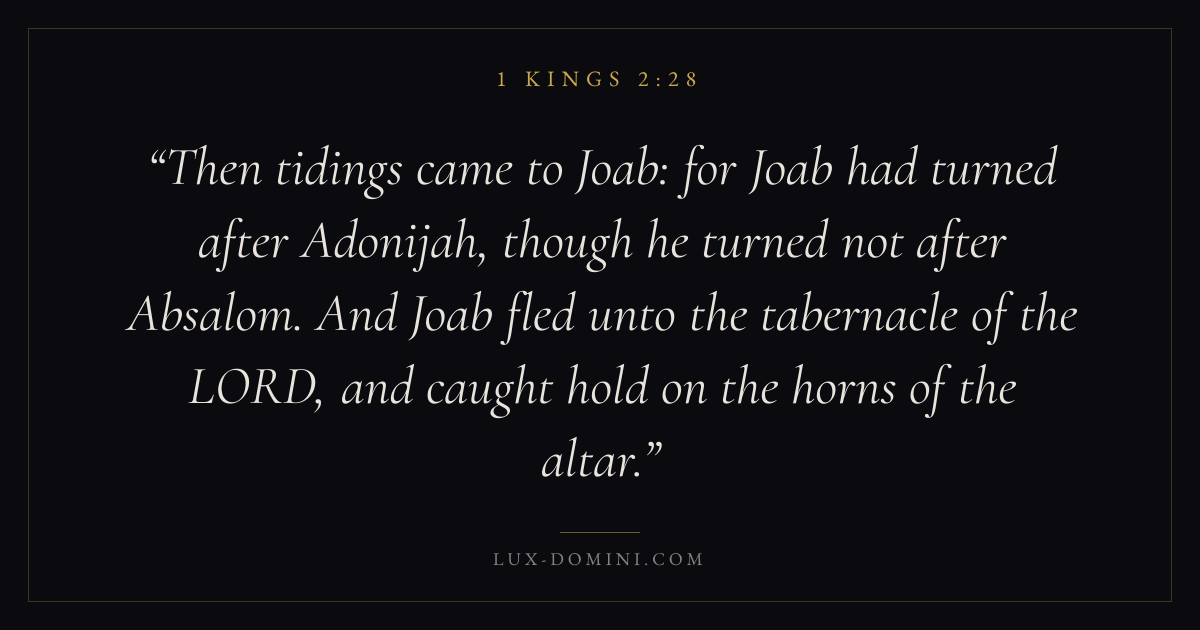 Then tidings came to Joab: for Joab had turned after Adonijah, though he turned not after Absalom. And Joab fled unto the tabernacle of the LORD, and caught hold on the horns of the altar.