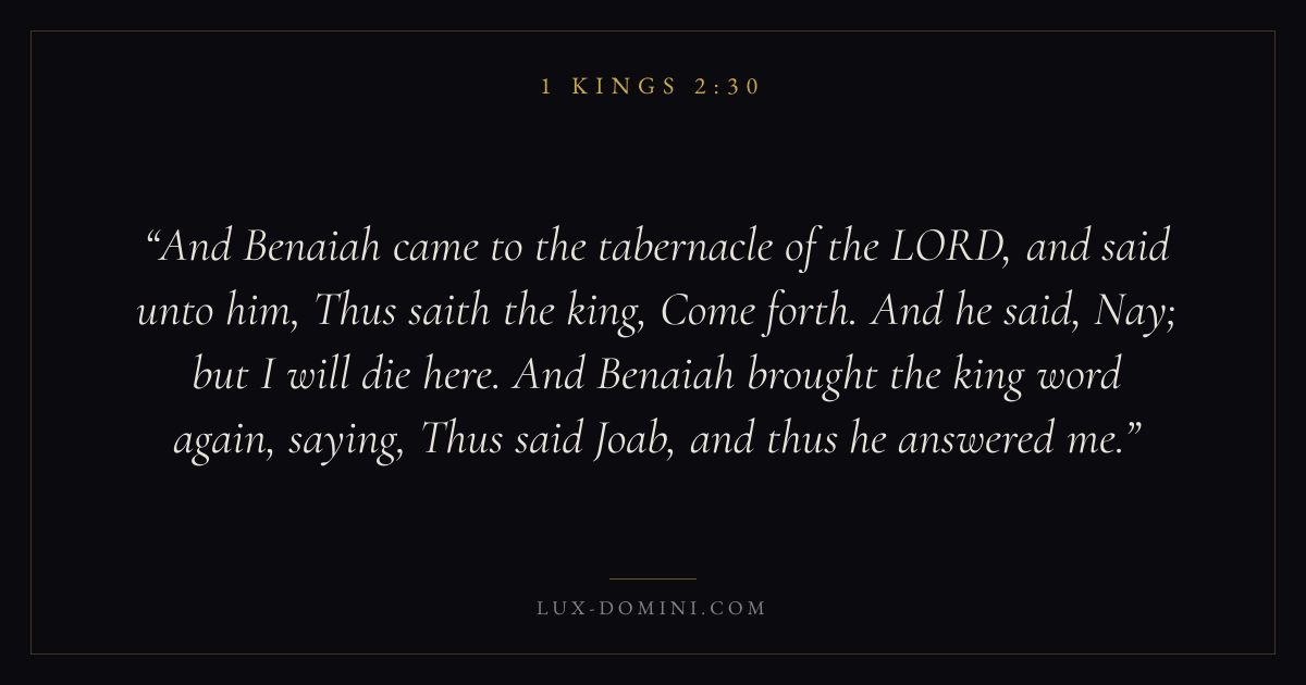 And Benaiah came to the tabernacle of the LORD, and said unto him, Thus saith the king, Come forth. And he said, Nay; but I will die here. And Benaiah brought the king word again, saying, Thus said Joab, and thus he answered me.