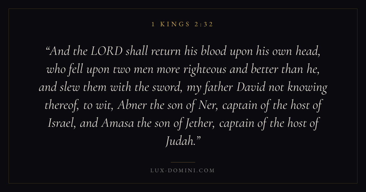And the LORD shall return his blood upon his own head, who fell upon two men more righteous and better than he, and slew them with the sword, my father David not knowing thereof, to wit, Abner the son of Ner, captain of the host of Israel, and Amasa the son of Jether, captain of the host of Judah.