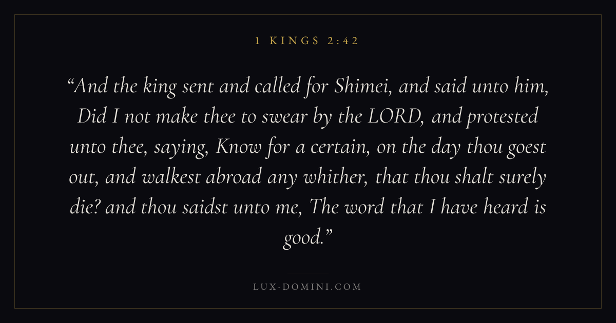 And the king sent and called for Shimei, and said unto him, Did I not make thee to swear by the LORD, and protested unto thee, saying, Know for a certain, on the day thou goest out, and walkest abroad any whither, that thou shalt surely die? and thou saidst unto me, The word that I have heard is good.