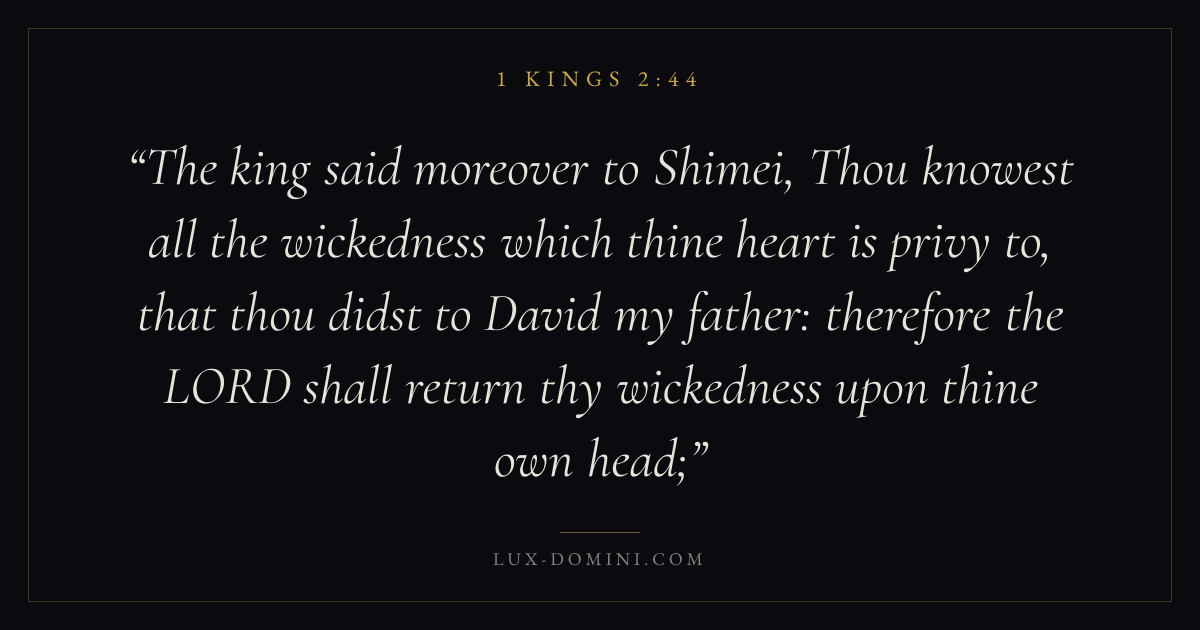 The king said moreover to Shimei, Thou knowest all the wickedness which thine heart is privy to, that thou didst to David my father: therefore the LORD shall return thy wickedness upon thine own head;