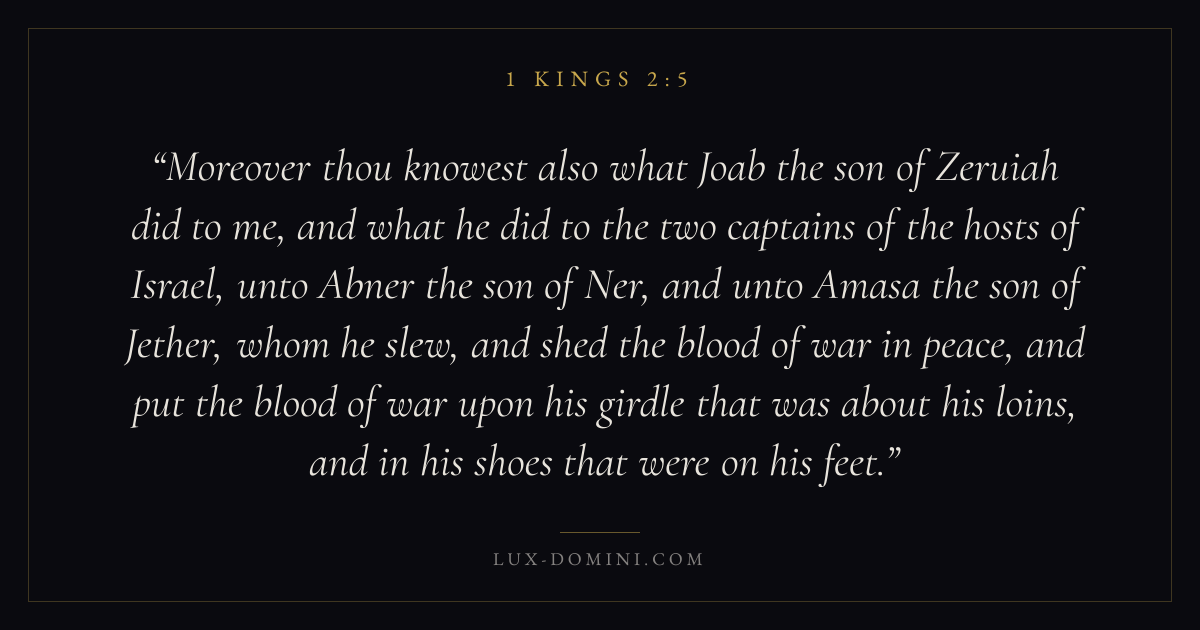Moreover thou knowest also what Joab the son of Zeruiah did to me, and what he did to the two captains of the hosts of Israel, unto Abner the son of Ner, and unto Amasa the son of Jether, whom he slew, and shed the blood of war in peace, and put the blood of war upon his girdle that was about his loins, and in his shoes that were on his feet.