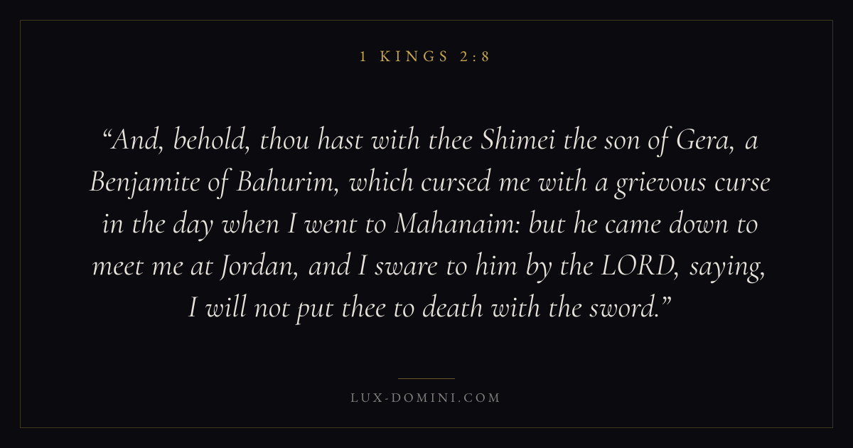 And, behold, thou hast with thee Shimei the son of Gera, a Benjamite of Bahurim, which cursed me with a grievous curse in the day when I went to Mahanaim: but he came down to meet me at Jordan, and I sware to him by the LORD, saying, I will not put thee to death with the sword.
