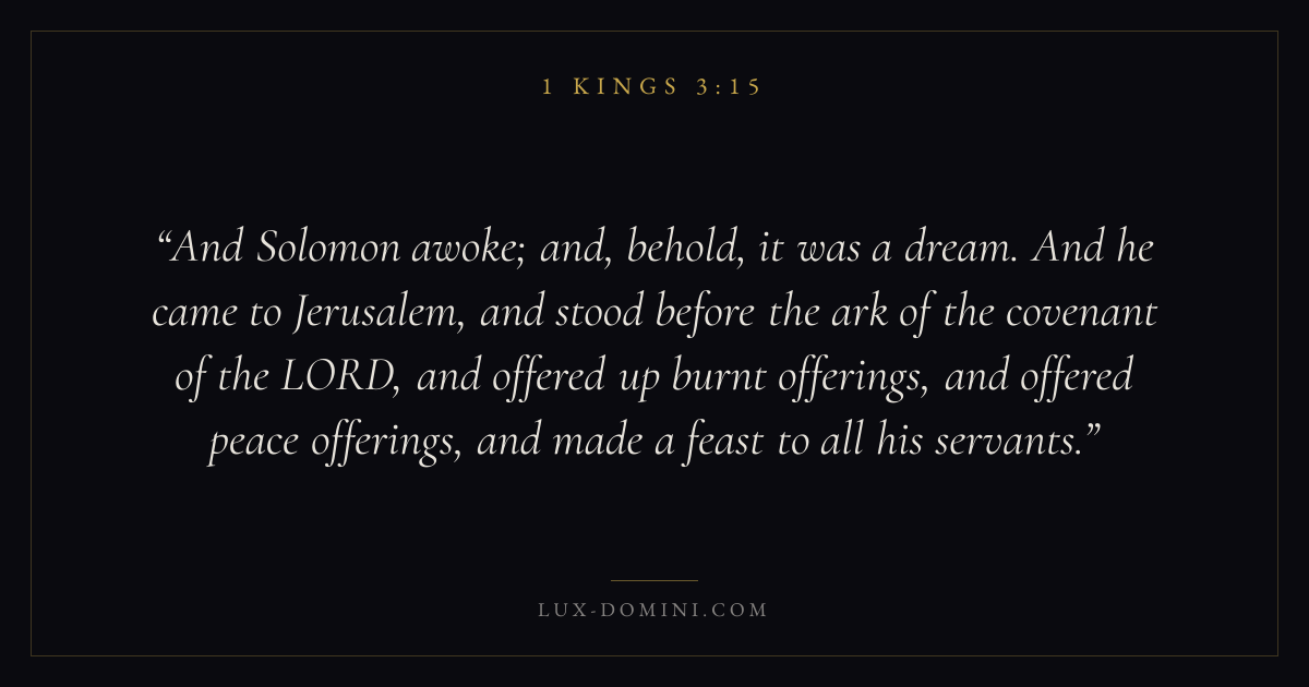And Solomon awoke; and, behold, it was a dream. And he came to Jerusalem, and stood before the ark of the covenant of the LORD, and offered up burnt offerings, and offered peace offerings, and made a feast to all his servants.