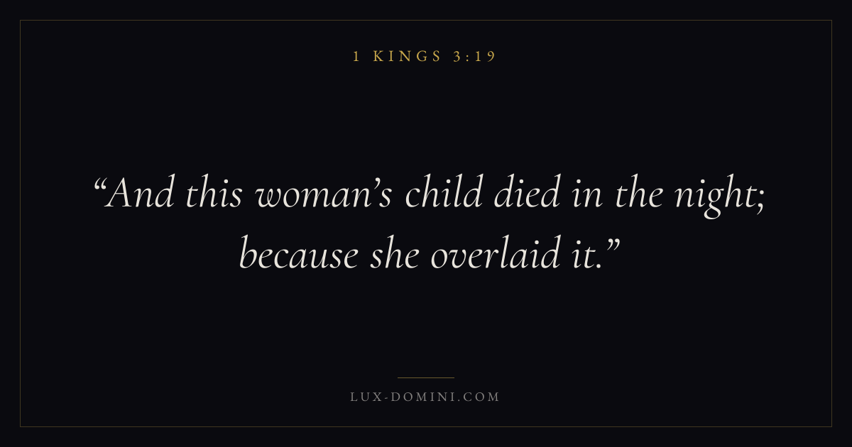 Books / 1 Kings / Chapter 3 / Verse 19 ← 1 Kings 3:18 1 Kings 3:19 1 Kings 3:20 → And this woman’s child died in the night; because she overlaid it. Download verse card Share on Twitter Share on Facebook Pin it ✦ Key themes WisdomJustice and mercyTempleIdolatry Read with 1 Kings 3:161 Kings 3:17Proverbs 1:7James 1:5 Related topics Bible verses about wisdomBible verses about justice and mercy ✦ 1 Kings Chapter 3 verses V. 1 V. 2 V. 3 V. 4 V. 5 V. 6 V. 7 V. 8 V. 9 V. 10 V. 11 V. 12 V. 13 V. 14 V. 15 V. 16 V. 17 V. 18 V. 19 V. 20 V. 21 V. 22 V. 23 V. 24 V. 25 V. 26 V. 27 V. 28