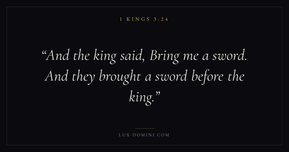 Books / 1 Kings / Chapter 3 / Verse 24 ← 1 Kings 3:23 1 Kings 3:24 1 Kings 3:25 → And the king said, Bring me a sword. And they brought a sword before the king. Download verse card Share on Twitter Share on Facebook Pin it ✦ Key themes WisdomJustice and mercyTempleIdolatry Read with 1 Kings 3:211 Kings 3:22Proverbs 1:7James 1:5 Related topics Bible verses about wisdomBible verses about justice and mercy ✦ 1 Kings Chapter 3 verses V. 1 V. 2 V. 3 V. 4 V. 5 V. 6 V. 7 V. 8 V. 9 V. 10 V. 11 V. 12 V. 13 V. 14 V. 15 V. 16 V. 17 V. 18 V. 19 V. 20 V. 21 V. 22 V. 23 V. 24 V. 25 V. 26 V. 27 V. 28