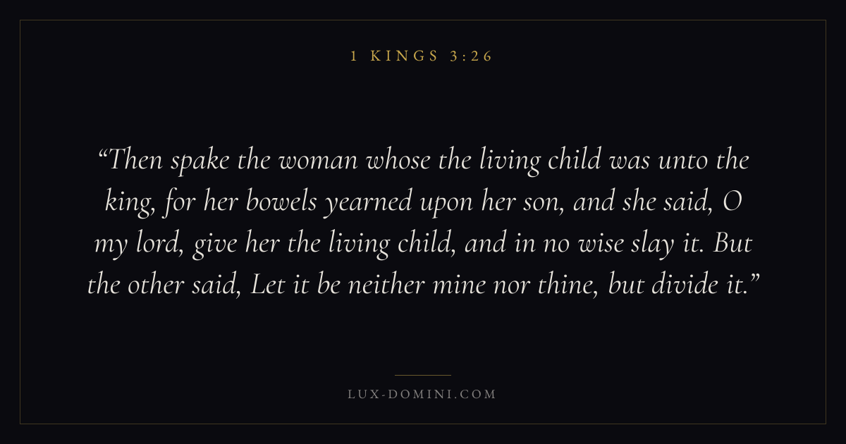 Then spake the woman whose the living child was unto the king, for her bowels yearned upon her son, and she said, O my lord, give her the living child, and in no wise slay it. But the other said, Let it be neither mine nor thine, but divide it.