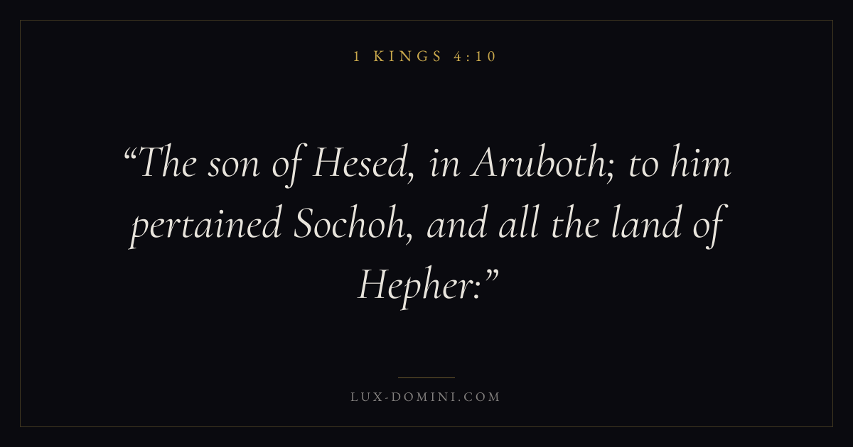 Books / 1 Kings / Chapter 4 / Verse 10 ← 1 Kings 4:9 1 Kings 4:10 1 Kings 4:11 → The son of Hesed, in Aruboth; to him pertained Sochoh, and all the land of Hepher: Download verse card Share on Twitter Share on Facebook Pin it ✦ Key themes WisdomJustice and mercyTempleIdolatry Read with 1 Kings 4:71 Kings 4:8Proverbs 1:7James 1:5 Related topics Bible verses about wisdomBible verses about justice and mercy Glossary Arubboth Place Biblical settlement. Modern identification: Khirbet el Hamam. Hepher Place Biblical settlement. Modern identification: Tell el Muhaffar. Socoh Place Biblical settlement. Modern identification: Khirbet Shuweikat er Ras. ✦ 1 Kings Chapter 4 verses V. 1 V. 2 V. 3 V. 4 V. 5 V. 6 V. 7 V. 8 V. 9 V. 10 V. 11 V. 12 V. 13 V. 14 V. 15 V. 16 V. 17 V. 18 V. 19 V. 20 V. 21 V. 22 V. 23 V. 24 V. 25 V. 26 V. 27 V. 28 V. 29 V. 30 V. 31 V. 32 V. 33 V. 34
