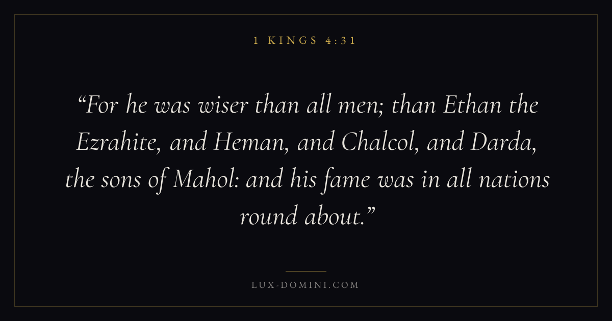 For he was wiser than all men; than Ethan the Ezrahite, and Heman, and Chalcol, and Darda, the sons of Mahol: and his fame was in all nations round about.