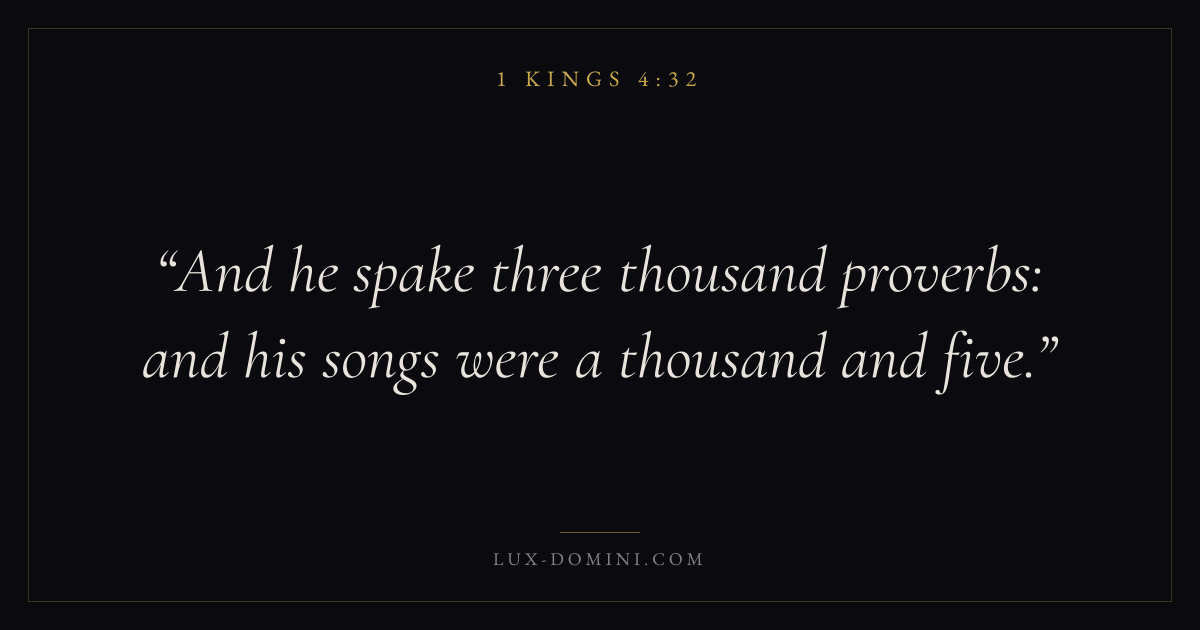 Books / 1 Kings / Chapter 4 / Verse 32 ← 1 Kings 4:31 1 Kings 4:32 1 Kings 4:33 → And he spake three thousand proverbs: and his songs were a thousand and five. Download verse card Share on Twitter Share on Facebook Pin it ✦ Key themes WisdomJustice and mercyTempleIdolatry Read with 1 Kings 4:291 Kings 4:30Proverbs 1:7James 1:5 Related topics Bible verses about wisdomBible verses about justice and mercy ✦ 1 Kings Chapter 4 verses V. 1 V. 2 V. 3 V. 4 V. 5 V. 6 V. 7 V. 8 V. 9 V. 10 V. 11 V. 12 V. 13 V. 14 V. 15 V. 16 V. 17 V. 18 V. 19 V. 20 V. 21 V. 22 V. 23 V. 24 V. 25 V. 26 V. 27 V. 28 V. 29 V. 30 V. 31 V. 32 V. 33 V. 34