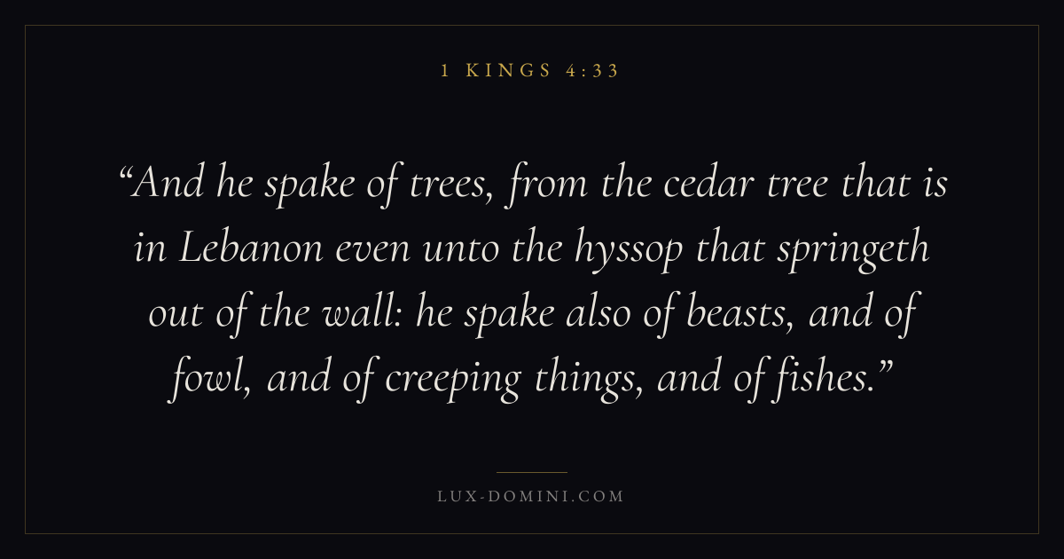 And he spake of trees, from the cedar tree that is in Lebanon even unto the hyssop that springeth out of the wall: he spake also of beasts, and of fowl, and of creeping things, and of fishes.