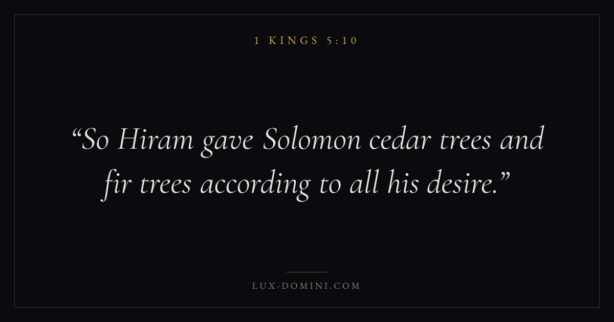 Books / 1 Kings / Chapter 5 / Verse 10 ← 1 Kings 5:9 1 Kings 5:10 1 Kings 5:11 → So Hiram gave Solomon cedar trees and fir trees according to all his desire. Download verse card Share on Twitter Share on Facebook Pin it ✦ Key themes WisdomJustice and mercyTempleIdolatry Read with 1 Kings 5:111 Kings 5:12Proverbs 1:7James 1:5 Related topics Bible verses about wisdomBible verses about justice and mercy ✦ 1 Kings Chapter 5 verses V. 1 V. 2 V. 3 V. 4 V. 5 V. 6 V. 7 V. 8 V. 9 V. 10 V. 11 V. 12 V. 13 V. 14 V. 15 V. 16 V. 17 V. 18