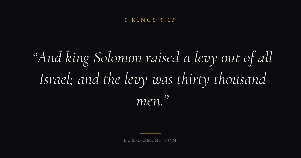 Books / 1 Kings / Chapter 5 / Verse 13 ← 1 Kings 5:12 1 Kings 5:13 1 Kings 5:14 → And king Solomon raised a levy out of all Israel; and the levy was thirty thousand men. Download verse card Share on Twitter Share on Facebook Pin it ✦ Key themes WisdomJustice and mercyTempleIdolatry Read with 1 Kings 5:141 Kings 5:15Proverbs 1:7James 1:5 Related topics Bible verses about wisdomBible verses about justice and mercy ✦ 1 Kings Chapter 5 verses V. 1 V. 2 V. 3 V. 4 V. 5 V. 6 V. 7 V. 8 V. 9 V. 10 V. 11 V. 12 V. 13 V. 14 V. 15 V. 16 V. 17 V. 18