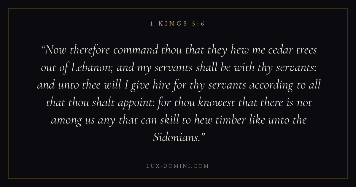 Now therefore command thou that they hew me cedar trees out of Lebanon; and my servants shall be with thy servants: and unto thee will I give hire for thy servants according to all that thou shalt appoint: for thou knowest that there is not among us any that can skill to hew timber like unto the Sidonians.
