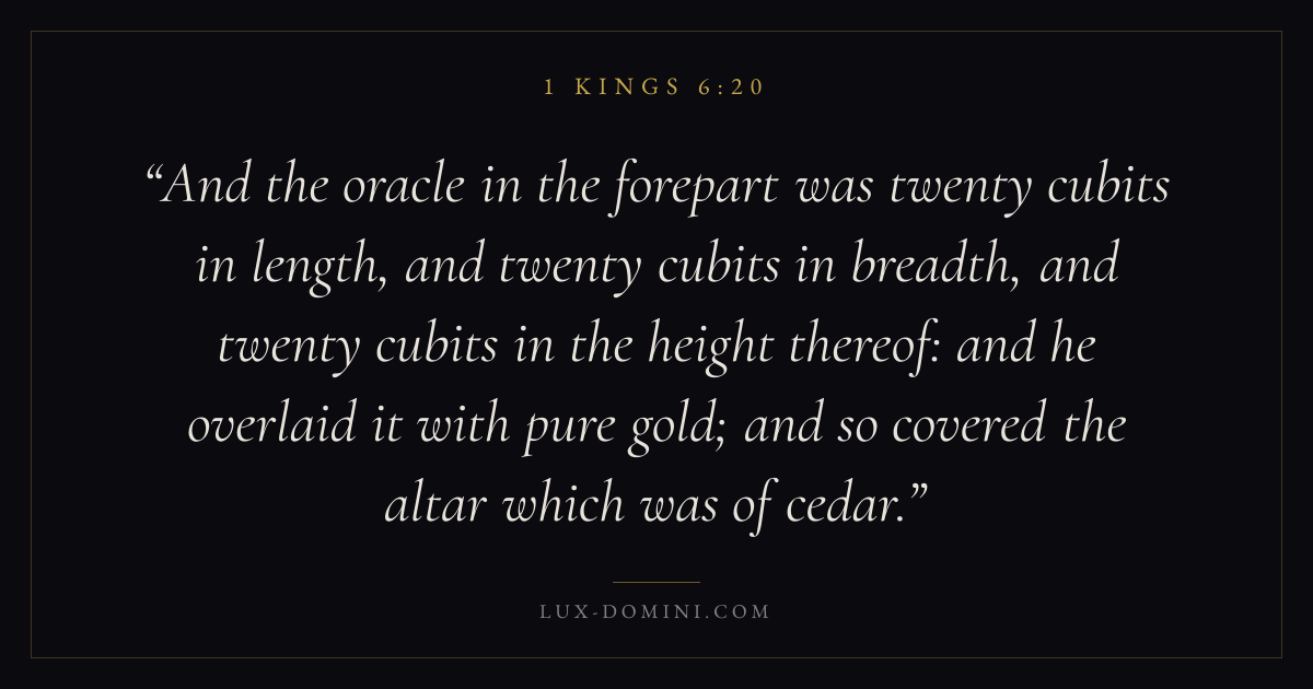 And the oracle in the forepart was twenty cubits in length, and twenty cubits in breadth, and twenty cubits in the height thereof: and he overlaid it with pure gold; and so covered the altar which was of cedar.
