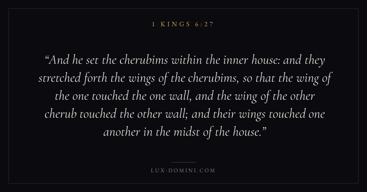And he set the cherubims within the inner house: and they stretched forth the wings of the cherubims, so that the wing of the one touched the one wall, and the wing of the other cherub touched the other wall; and their wings touched one another in the midst of the house.