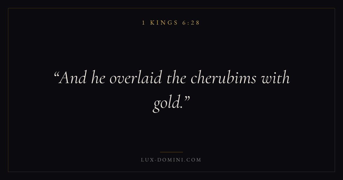 Books / 1 Kings / Chapter 6 / Verse 28 ← 1 Kings 6:27 1 Kings 6:28 1 Kings 6:29 → And he overlaid the cherubims with gold. Download verse card Share on Twitter Share on Facebook Pin it ✦ Key themes WisdomJustice and mercyTruthTemple Read with 1 Kings 6:261 Kings 6:27Proverbs 1:7James 1:5 Related topics Bible verses about wisdomBible verses about justice and mercyBible verses about truth ✦ 1 Kings Chapter 6 verses V. 1 V. 2 V. 3 V. 4 V. 5 V. 6 V. 7 V. 8 V. 9 V. 10 V. 11 V. 12 V. 13 V. 14 V. 15 V. 16 V. 17 V. 18 V. 19 V. 20 V. 21 V. 22 V. 23 V. 24 V. 25 V. 26 V. 27 V. 28 V. 29 V. 30 V. 31 V. 32 V. 33 V. 34 V. 35 V. 36 V. 37 V. 38
