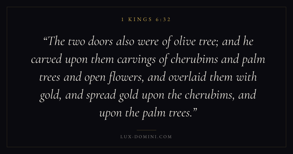 The two doors also were of olive tree; and he carved upon them carvings of cherubims and palm trees and open flowers, and overlaid them with gold, and spread gold upon the cherubims, and upon the palm trees.