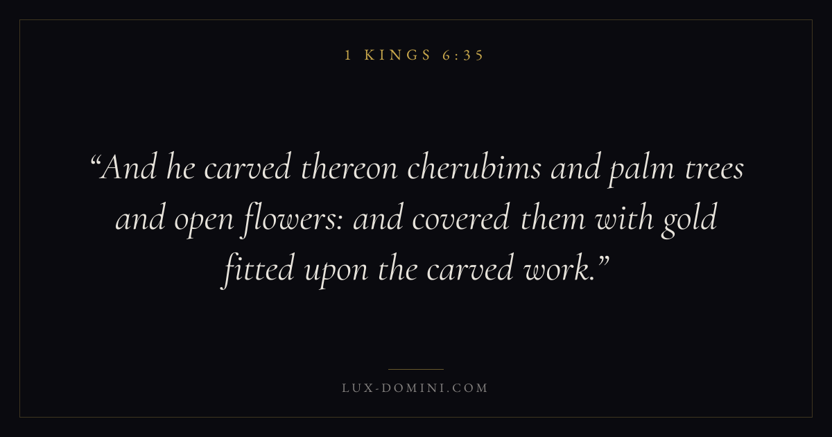 And he carved thereon cherubims and palm trees and open flowers: and covered them with gold fitted upon the carved work.