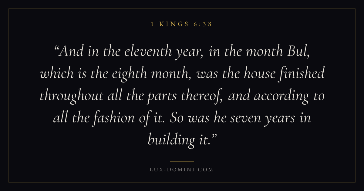 And in the eleventh year, in the month Bul, which is the eighth month, was the house finished throughout all the parts thereof, and according to all the fashion of it. So was he seven years in building it.