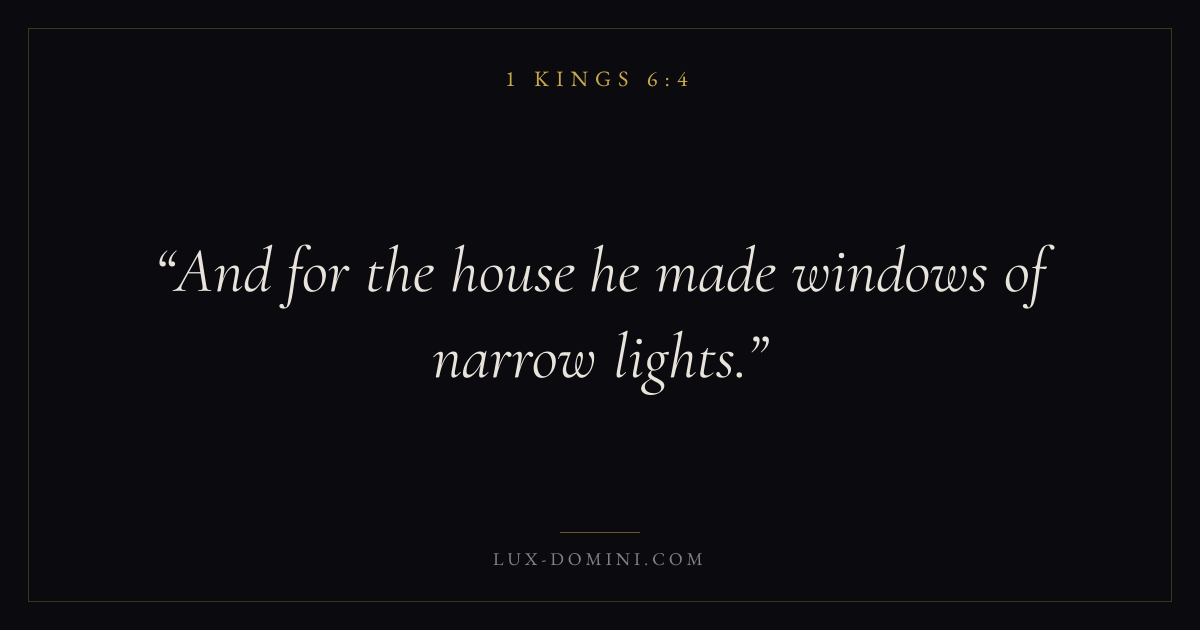 Books / 1 Kings / Chapter 6 / Verse 4 ← 1 Kings 6:3 1 Kings 6:4 1 Kings 6:5 → And for the house he made windows of narrow lights. Download verse card Share on Twitter Share on Facebook Pin it ✦ Key themes WisdomJustice and mercyTempleIdolatry Read with 1 Kings 6:11 Kings 6:2Proverbs 1:7James 1:5 Related topics Bible verses about wisdomBible verses about justice and mercy ✦ 1 Kings Chapter 6 verses V. 1 V. 2 V. 3 V. 4 V. 5 V. 6 V. 7 V. 8 V. 9 V. 10 V. 11 V. 12 V. 13 V. 14 V. 15 V. 16 V. 17 V. 18 V. 19 V. 20 V. 21 V. 22 V. 23 V. 24 V. 25 V. 26 V. 27 V. 28 V. 29 V. 30 V. 31 V. 32 V. 33 V. 34 V. 35 V. 36 V. 37 V. 38