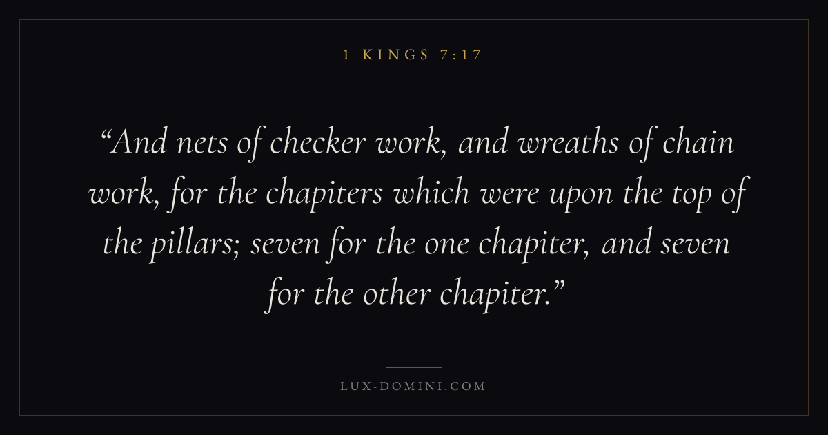 And nets of checker work, and wreaths of chain work, for the chapiters which were upon the top of the pillars; seven for the one chapiter, and seven for the other chapiter.