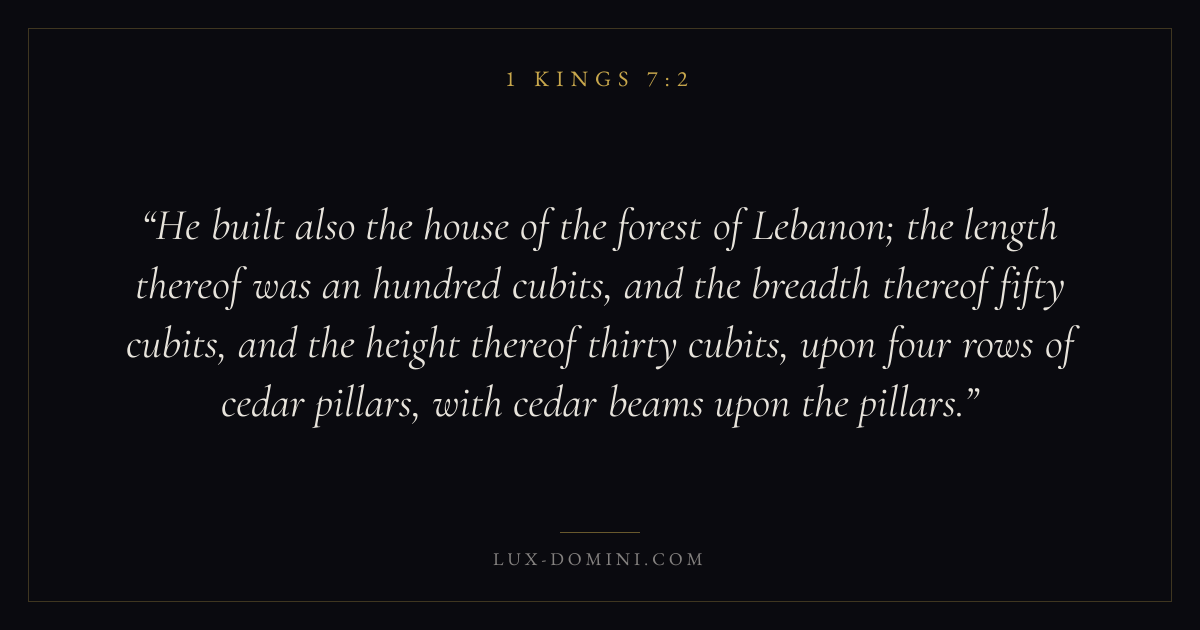 He built also the house of the forest of Lebanon; the length thereof was an hundred cubits, and the breadth thereof fifty cubits, and the height thereof thirty cubits, upon four rows of cedar pillars, with cedar beams upon the pillars.