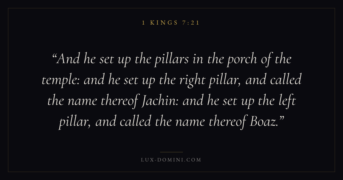 And he set up the pillars in the porch of the temple: and he set up the right pillar, and called the name thereof Jachin: and he set up the left pillar, and called the name thereof Boaz.