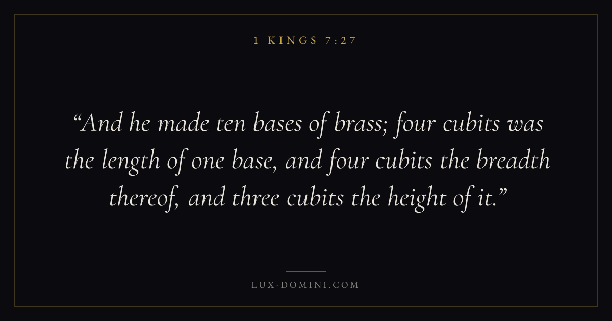 And he made ten bases of brass; four cubits was the length of one base, and four cubits the breadth thereof, and three cubits the height of it.