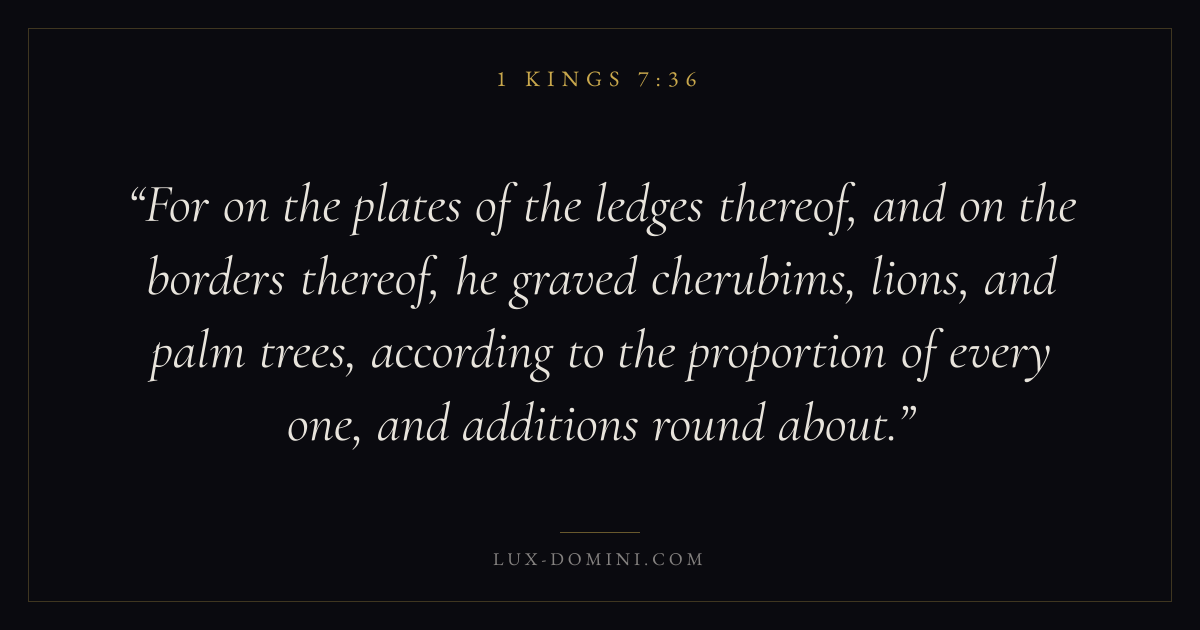 For on the plates of the ledges thereof, and on the borders thereof, he graved cherubims, lions, and palm trees, according to the proportion of every one, and additions round about.
