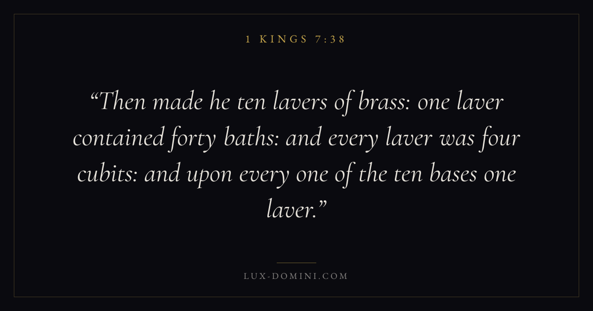 Then made he ten lavers of brass: one laver contained forty baths: and every laver was four cubits: and upon every one of the ten bases one laver.