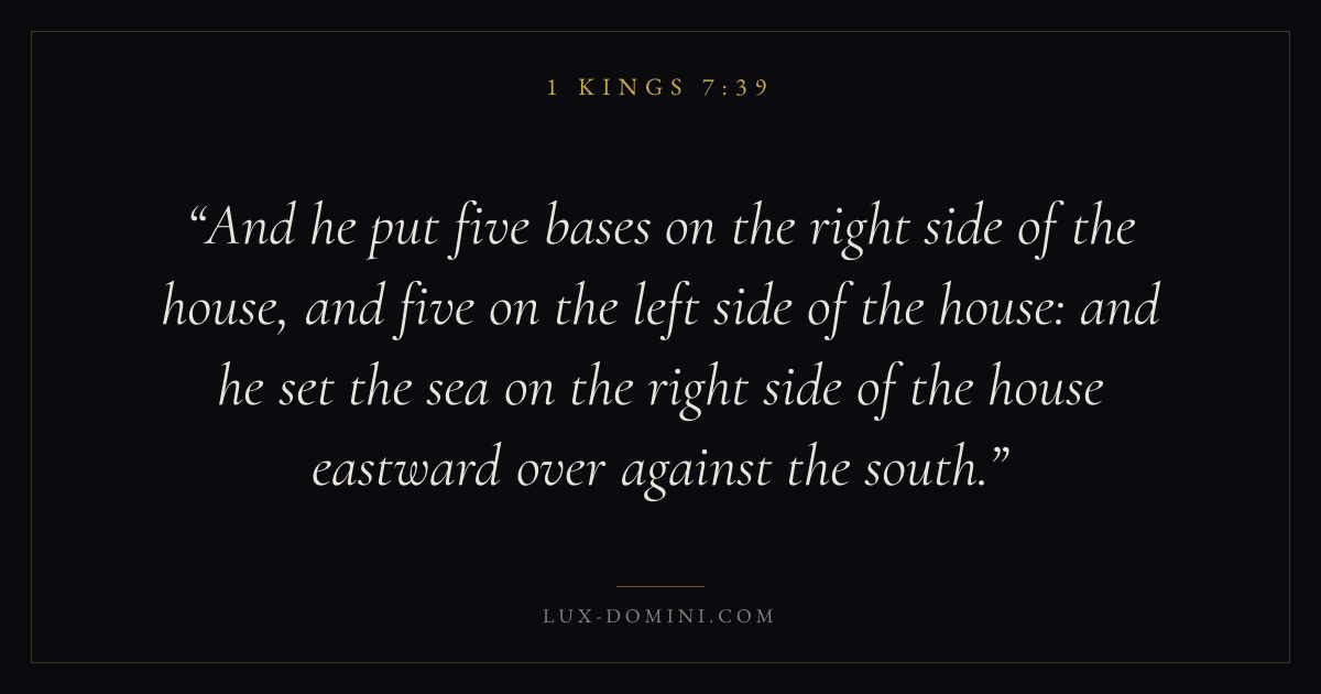 And he put five bases on the right side of the house, and five on the left side of the house: and he set the sea on the right side of the house eastward over against the south.