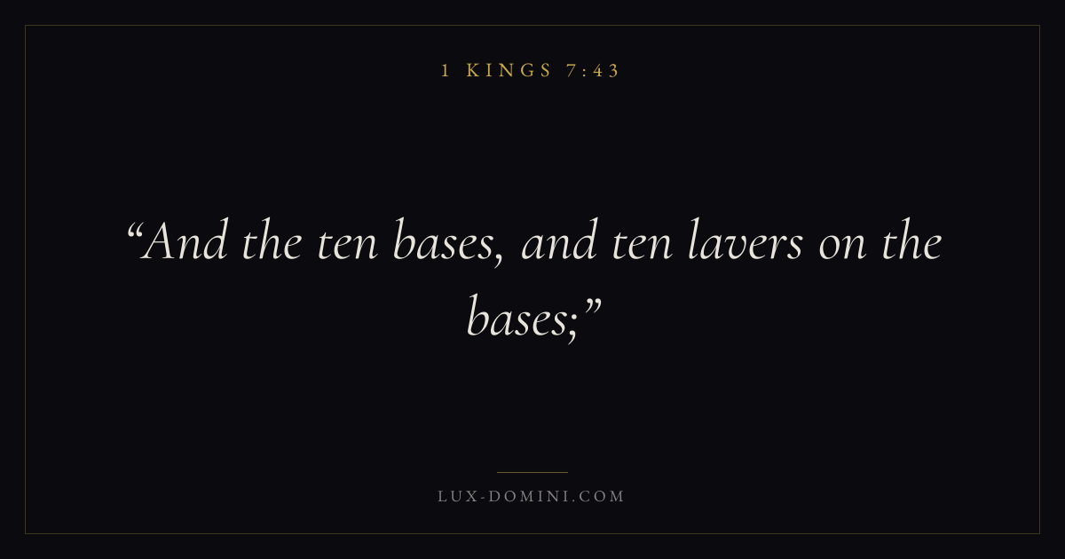 Books / 1 Kings / Chapter 7 / Verse 43 ← 1 Kings 7:42 1 Kings 7:43 1 Kings 7:44 → And the ten bases, and ten lavers on the bases; Download verse card Share on Twitter Share on Facebook Pin it ✦ Key themes WisdomJustice and mercyTempleIdolatry Read with 1 Kings 7:401 Kings 7:41Proverbs 1:7James 1:5 Related topics Bible verses about wisdomBible verses about justice and mercy ✦ 1 Kings Chapter 7 verses V. 1 V. 2 V. 3 V. 4 V. 5 V. 6 V. 7 V. 8 V. 9 V. 10 V. 11 V. 12 V. 13 V. 14 V. 15 V. 16 V. 17 V. 18 V. 19 V. 20 V. 21 V. 22 V. 23 V. 24 V. 25 V. 26 V. 27 V. 28 V. 29 V. 30 V. 31 V. 32 V. 33 V. 34 V. 35 V. 36 V. 37 V. 38 V. 39 V. 40 V. 41 V. 42 V. 43 V. 44 V. 45 V. 46 V. 47 V. 48 V. 49 V. 50 V. 51