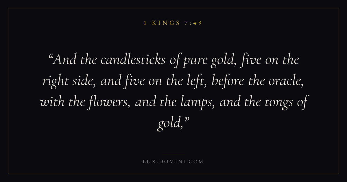 And the candlesticks of pure gold, five on the right side, and five on the left, before the oracle, with the flowers, and the lamps, and the tongs of gold,