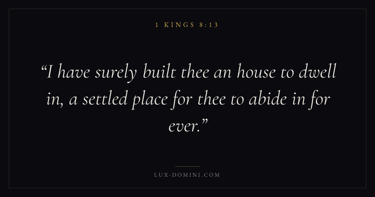 Books / 1 Kings / Chapter 8 / Verse 13 ← 1 Kings 8:12 1 Kings 8:13 1 Kings 8:14 → I have surely built thee an house to dwell in, a settled place for thee to abide in for ever. Download verse card Share on Twitter Share on Facebook Pin it ✦ Key themes HopeWisdomJustice and mercyTemple Read with 1 Kings 8:141 Kings 8:15Romans 8:24Revelation 21:4 Related topics Bible verses about hopeBible verses about wisdomBible verses about justice and mercy ✦ 1 Kings Chapter 8 verses V. 1 V. 2 V. 3 V. 4 V. 5 V. 6 V. 7 V. 8 V. 9 V. 10 V. 11 V. 12 V. 13 V. 14 V. 15 V. 16 V. 17 V. 18 V. 19 V. 20 V. 21 V. 22 V. 23 V. 24 V. 25 V. 26 V. 27 V. 28 V. 29 V. 30 V. 31 V. 32 V. 33 V. 34 V. 35 V. 36 V. 37 V. 38 V. 39 V. 40 V. 41 V. 42 V. 43 V. 44 V. 45 V. 46 V. 47 V. 48 V. 49 V. 50 V. 51 V. 52 V. 53 V. 54 V. 55 V. 56 V. 57 V. 58 V. 59 V. 60 V. 61 V. 62 V. 63 V. 64 V. 65 V. 66