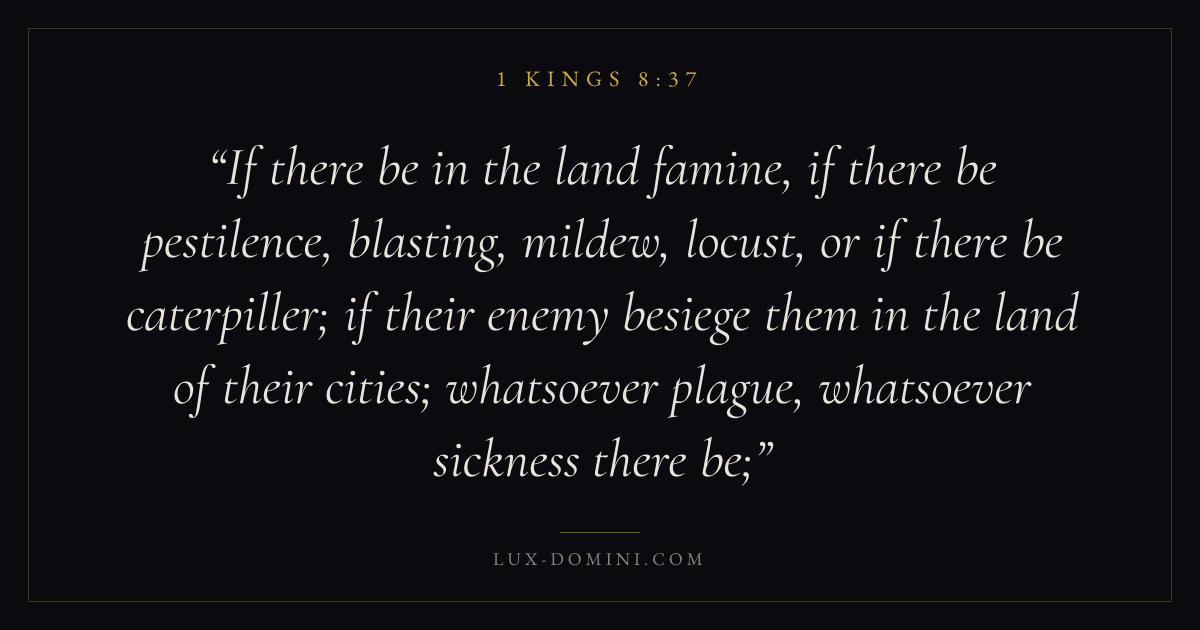 If there be in the land famine, if there be pestilence, blasting, mildew, locust, or if there be caterpiller; if their enemy besiege them in the land of their cities; whatsoever plague, whatsoever sickness there be;