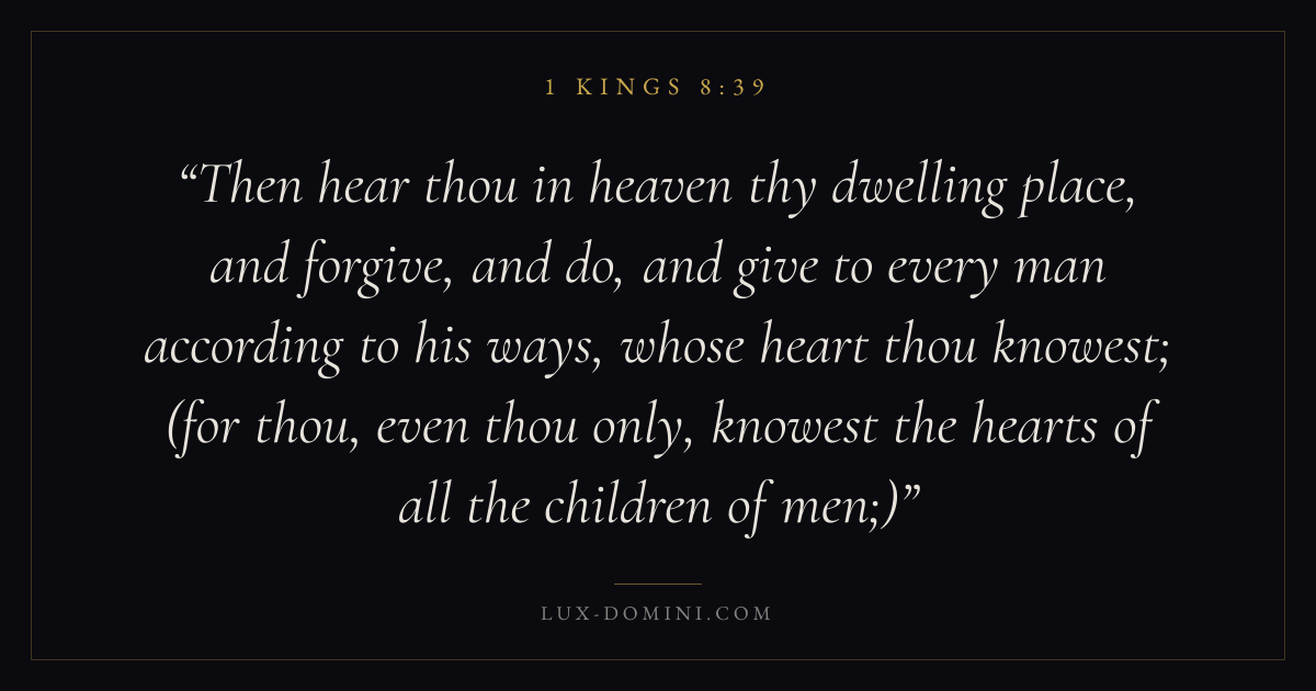 Then hear thou in heaven thy dwelling place, and forgive, and do, and give to every man according to his ways, whose heart thou knowest; (for thou, even thou only, knowest the hearts of all the children of men;)