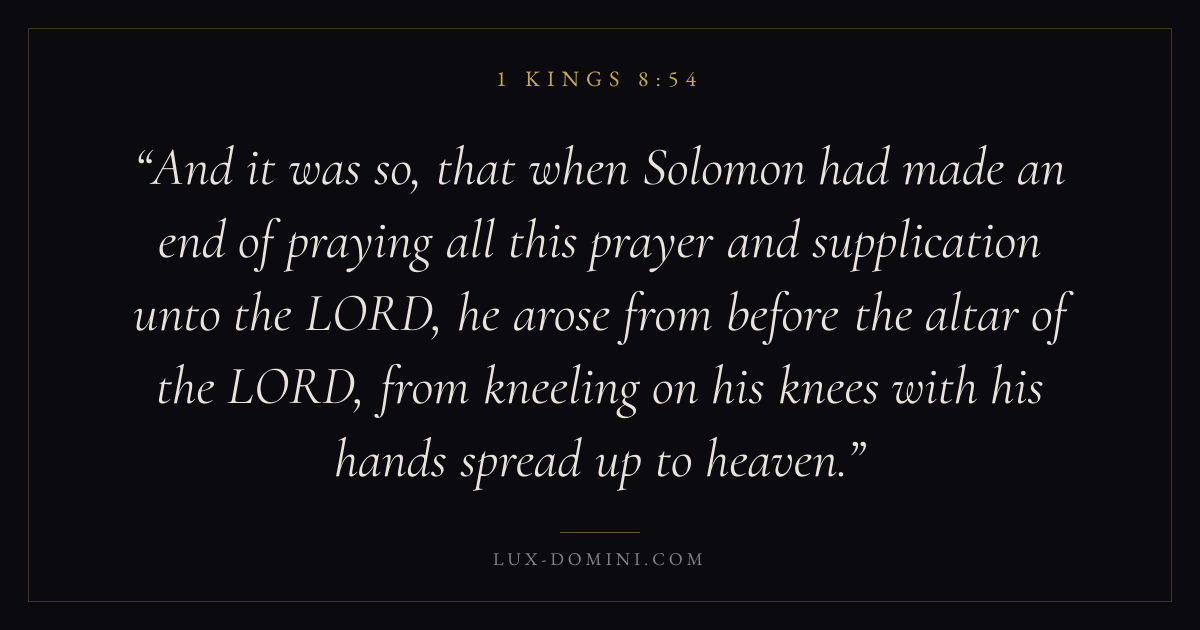 And it was so, that when Solomon had made an end of praying all this prayer and supplication unto the LORD, he arose from before the altar of the LORD, from kneeling on his knees with his hands spread up to heaven.